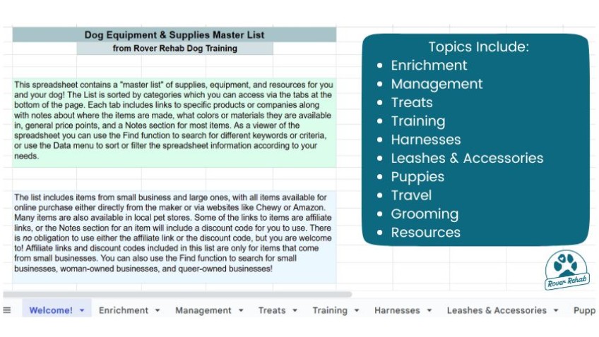 The Dog Equipment & Supplies Master List spreadsheet is sorted by categories and contains tons of information about training items, enrichment stuff, management solutions, and trusted resources on all things dog.