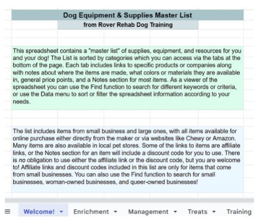 A comprehensive spreadsheet with detailed information about training, enrichment, management, grooming items, & tons of helpful resources!
